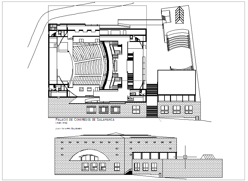 Building design for congress dwg file with in-out way,seating area for conference, staircase,door and window view in elevation,distribution of area,entry way.