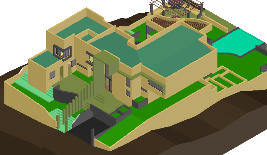 Housing model view in 3d dwg file with in-out way,ground level,step,entry way,door