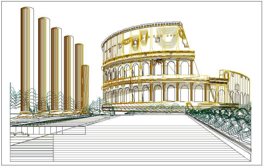 Historical design dwg file with walking way with step,garden view,round shaped beam,many of door and window in circular structure with designing work.