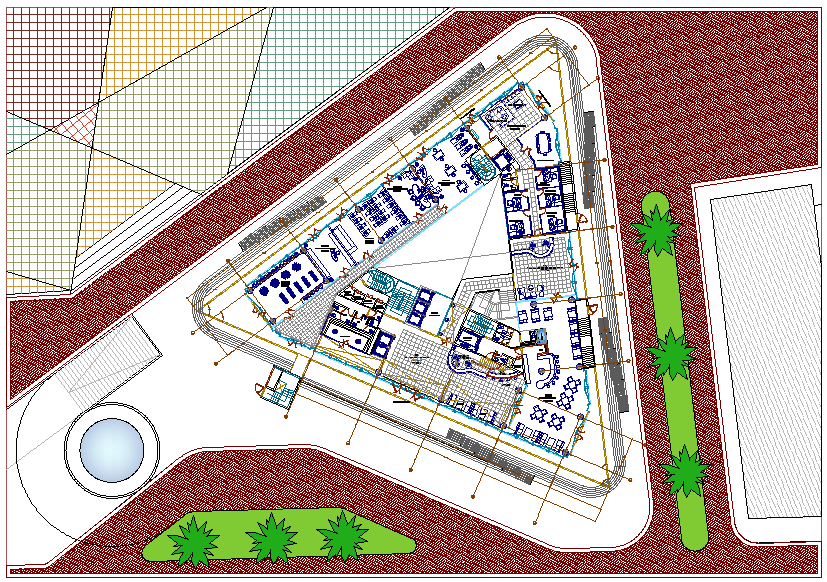 Landscape view of hotel dwg file with entry way,garden view,walking way,beauty shop,