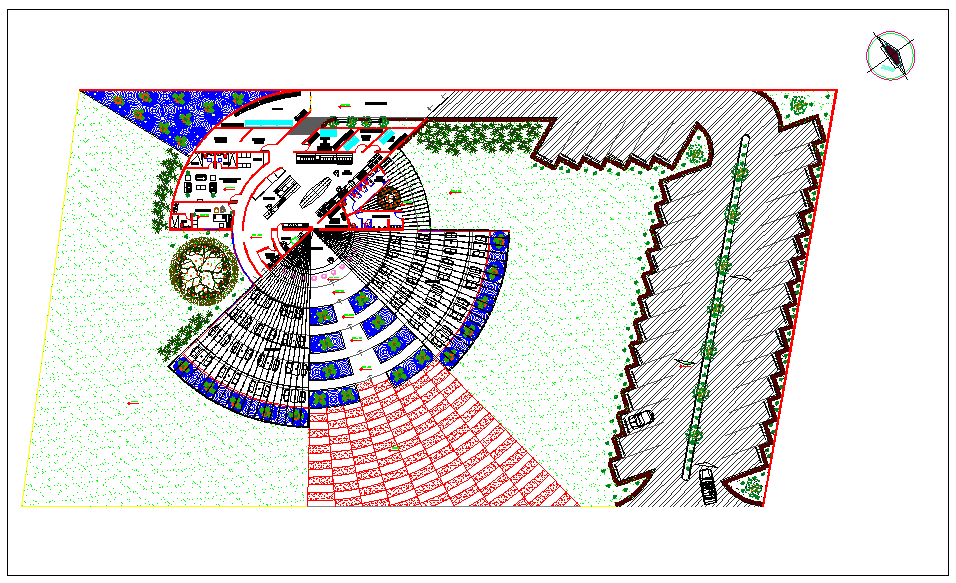 Landscape view of hotel dwg file with entry way,garden view,seating area,bar,washing area,wine beverages area,kitchen,parking way,designer flooring view,office area,table