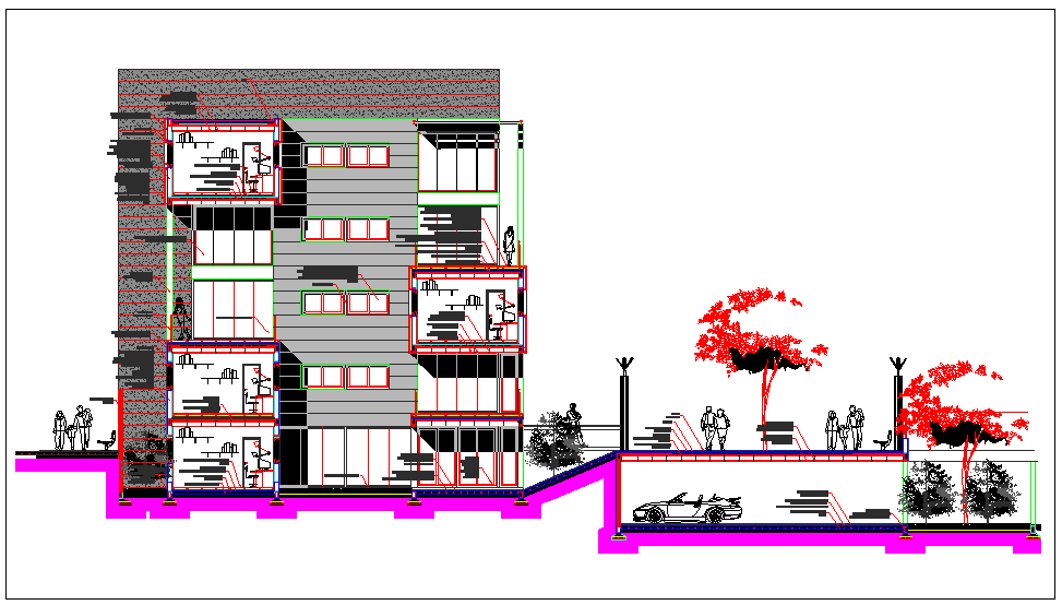 Design of multi family housing dwg file with parking view and floor view which in elevation and door,window and tree view in design.