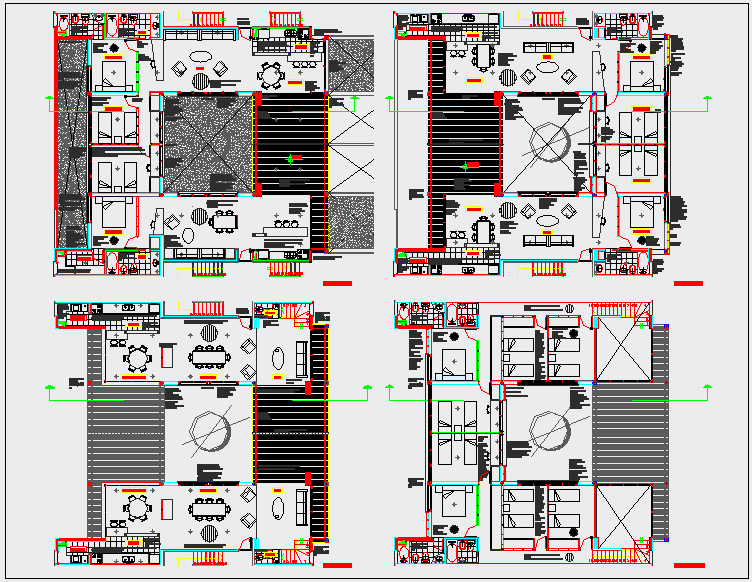 Housing plan design for multi family file of autocad with view of bedroom,dining area, kitchen,washing area,flooring view and distribution of area.