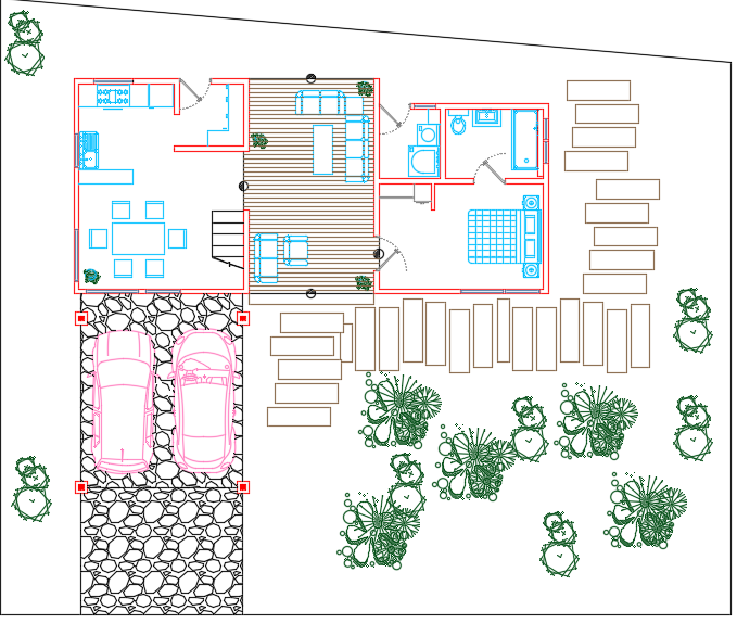 Bungalow dwg file , layout plan of a big Bungalow, elevation design of Bungalow, posh Bungalow design ,landscaping, trees, big hall, rooms, exotic design