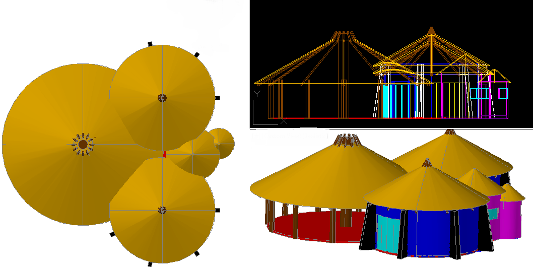 This AutoCAD DWG file features a highly detailed 3D wooden house CAD drawing, including a rendered structure view for architectural visualization. The design showcases a unique layout with circular roof formations, interlinked spaces, and realistic structural modeling. Each component has been carefully drafted to provide a clear visualization of the building’s geometry, roof design, and construction elements. This drawing serves as a ready-to-edit reference for professionals working on wooden architecture, resort cottages, eco-lodges, or themed structures.