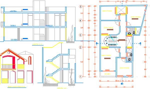 acomodation dwg file, elevation of a bungalow , front , side view, layout plan of with furniture details