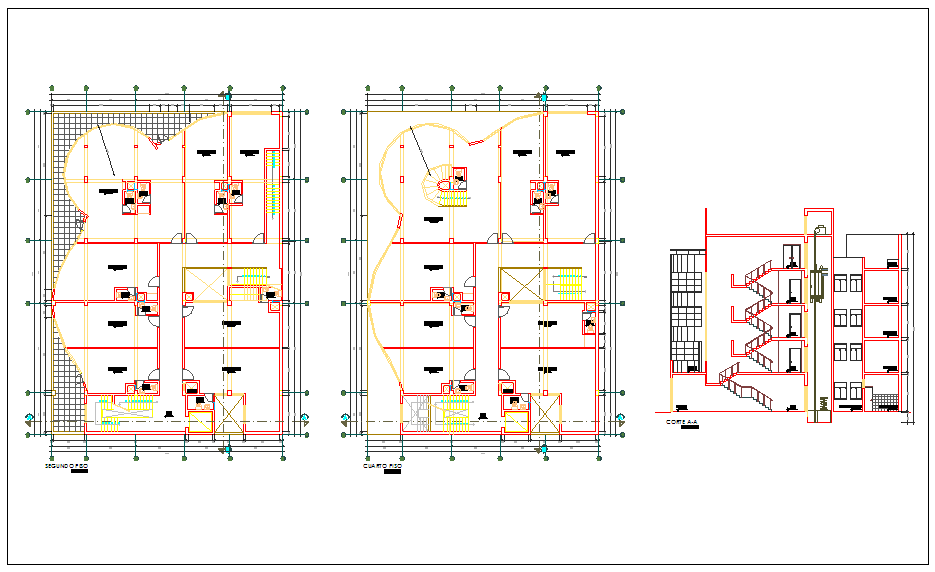 Design of office for corporate autocad file with view of hall,staircase,washing area, office area and view of elevator,floor,balcony in elevation.