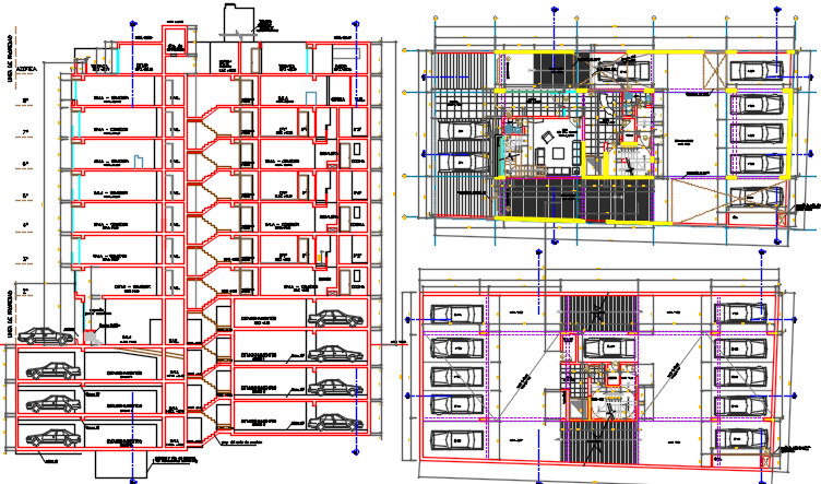 multi family housing dwg file, elevation of a big apartment , car parking layout , big building project