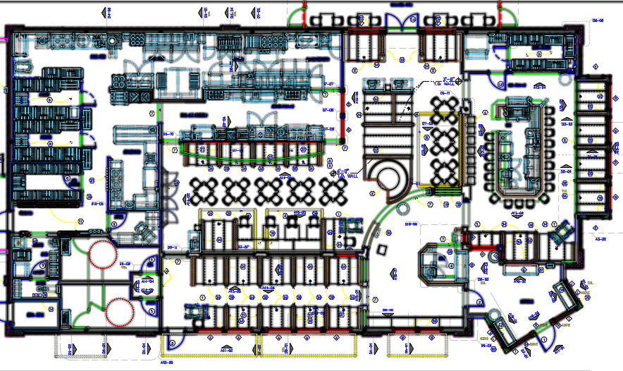 Pizza Restaurant plan dwg file. Find here layout plan along of furniture detailing in autocad format.
