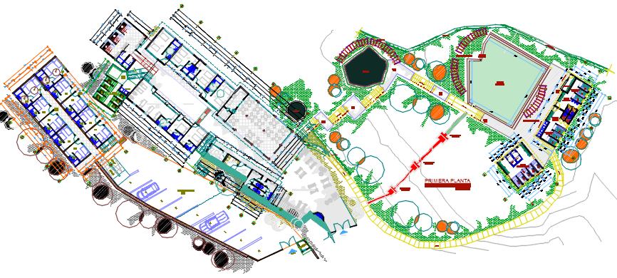 Hotel dwg file , layout plan of a big hotel, swimming pool, landscaping, trees, big hall, rooms, exotic design,