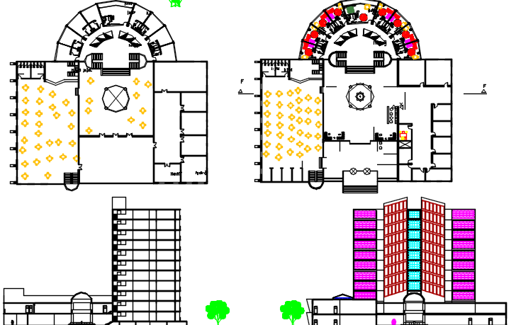 Hotel dwg file , layout plan of a big hotel, landscaping, trees, big hall, rooms, exotic design , circular design, furniture detail etc