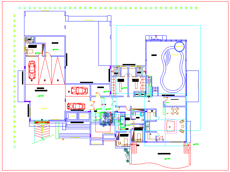 Plan drawing of house dwg file with entry way,parking,tree view,washing area,pool, floor office,bedroom,well of cold water,washing area,kitchen and distribution of area.