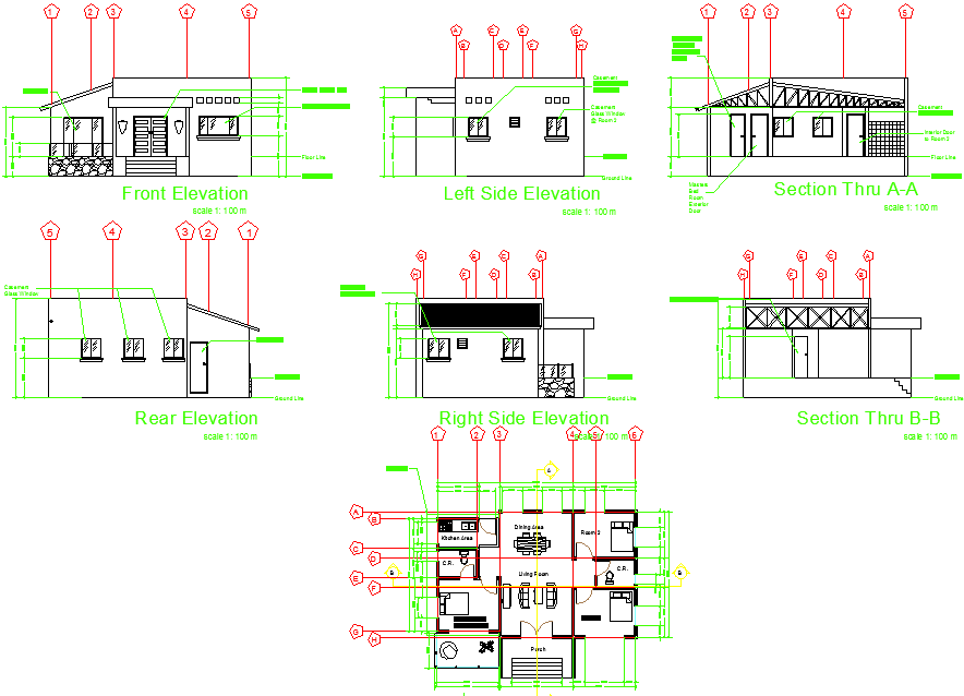 Layout plan include 3 bedroom, dining area, kitchen, living room also have detailing of section plan and elevation design of Single Story House Project.
