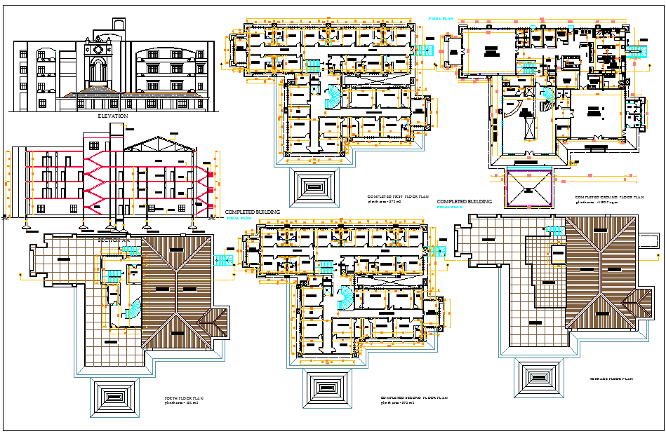 The architecture layout plan of all floor detail, roof plan, roof construction detail, sesction plan and elevation design of Government Municipal project.