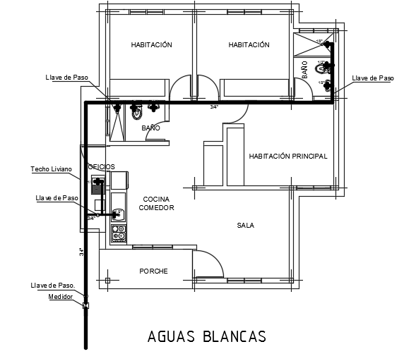 The outlet water line detail drawing of the 8x9m single story house plan 2d AutoCAD drawing is given in this model. On this plan, the common bathroom, attached bathroom, wash basin, and sink water lines are mentioned. On this ground floor, the living room, porch, kitchen, dining area, master bedroom with the attached toilet, kid’s room, guest room, and common bathroom is available. For more details download the AutoCAD drawing file from our cadbull website.