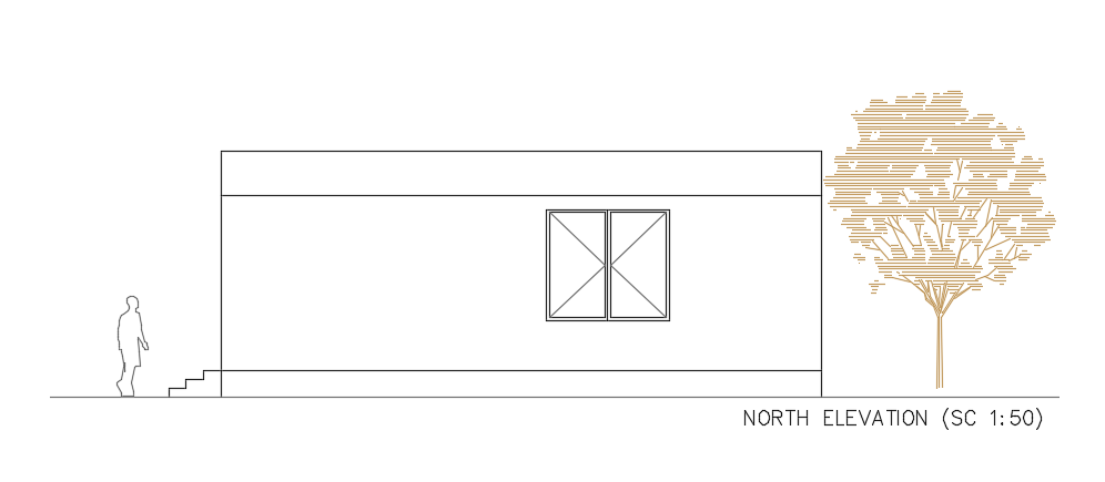 The north side elevation view of the 14x8m 1bhk house building AutoCAD drawing is given in this file. This is a single story house building. On this first floor, the living room, kitchen, dining area, laundry room, master bedroom, and common bathroom is available. For more details download the AutoCAD drawing file from our cadbull website.