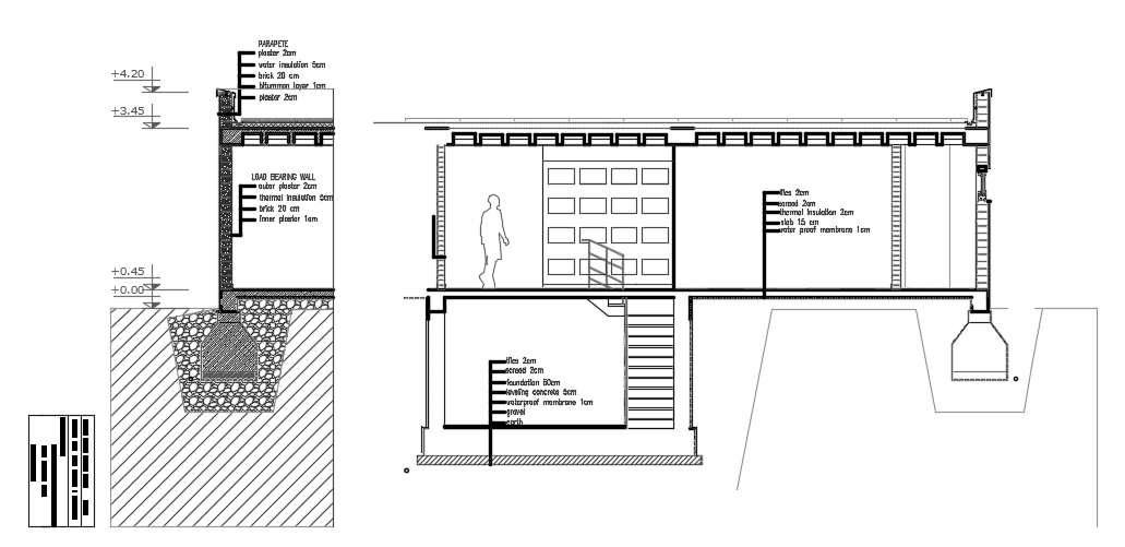 14x8m house building foundation section 2d drawing is given in this model. 2cm outer plaster is provided. 1cm inner plaster is provided. 20cm brick works were done. Other details are mentioned. For more details download the AutoCAD drawing file from our cadbull website.