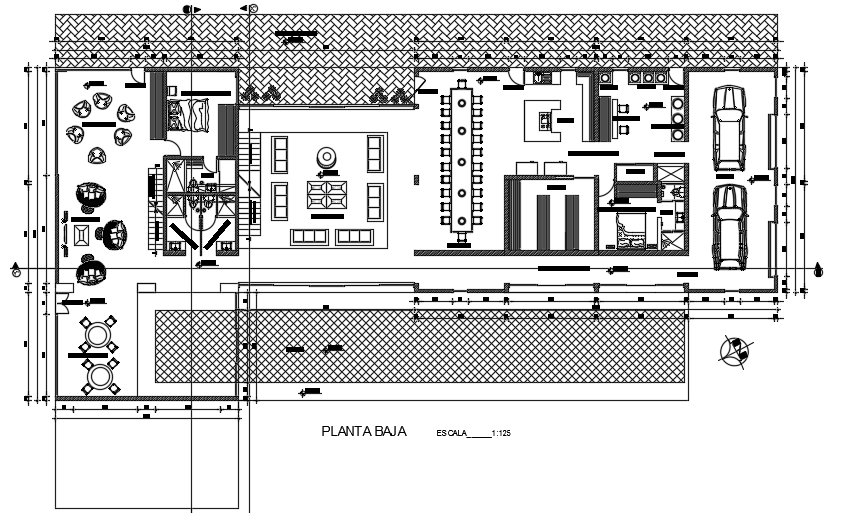 The furniture’s layout of the 40x18m multifamily ground floor villa plan 2d cad drawing is available in this file. This is two story house building. On this ground floor, the living room, TV room, rest area, hall, master bedroom with the attached toilet, ladies toilet, gent’s toilet, dining area, kitchen, maid room with the attached toilet, garage, and circulation area is available. For more details download the AutoCAD drawing file from our cadbull website.