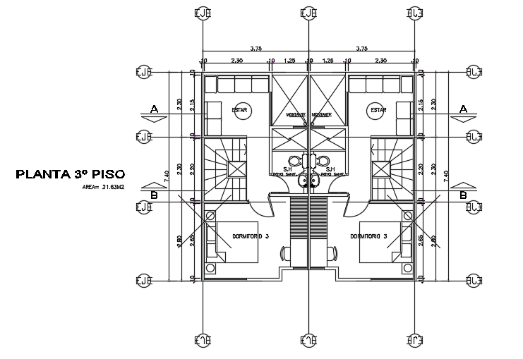 7x8m second floor duplex house plan cad diagram is given in this model. This is three story house building. This is a 3bhk duplex house building. On this second floor, the master bedroom, living room, and common bathroom is available. For more details download the AutoCAD drawing file from our cadbull website.