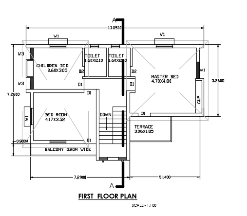 12x8m first floor plan 2D AutoCAD drawing is given in this model. This is G+ 1 house building. This is 3bhk house plan. On this first floor, the master bedroom with the attached toilet, kid’s room with the attached toilet, guest room, balcony, and terrace are available. For more details download the AutoCAD drawing file from our cadbull website.