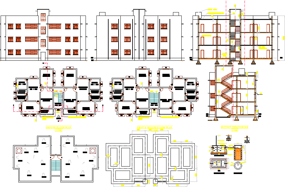 The architecture layout plan, beam detail and foundation plan, section plan, construction plan and elevation design of 3 Level Apartment project.
