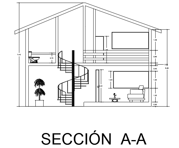 The back side cut section view of the round shape house building AutoCAD drawing is given in this file. The total height of the building up to roof level is 7.44m. This is a 2bhk house plan. This is a two story residential building. Ground floor, and first floor plans are given. On this ground floor, the living room, kitchen cum dining area, and open terrace is available. On the second floor, the master bedroom, kid’s room, and common bathroom is available. For more details download the AutoCAD drawing model from our cadbull website.