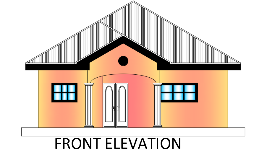 The front elevation view of the 7x12m 2bhk single story bungalow house building