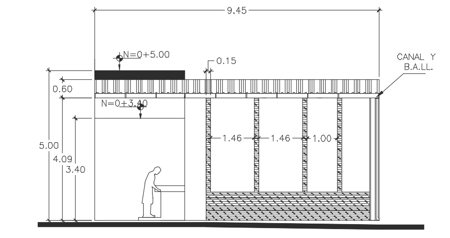 The left side section view of the 10x20m single story house building AutoCAD drawing is given in this file. The total height of the building is 5m. On this ground floor, the living room, kitchen, dining area, master bedroom, kid’s room, and common bathroom is available. For more details download the AutoCAD drawing file from our website. Thank you for downloading the AutoCAD drawing file from our website.