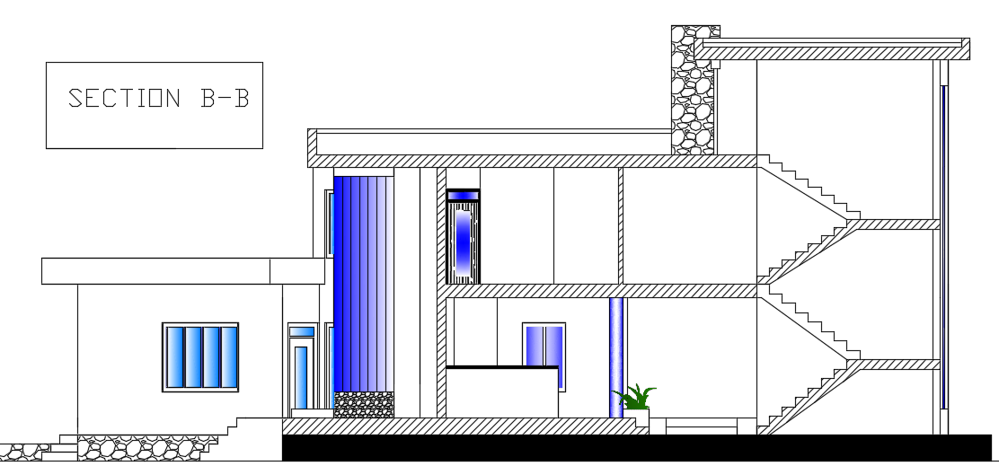 The left side section view of the 35x15m luxury villa building AutoCAD drawing is given in this file. This is two story villa building. On this ground floor, the garage, ware room, kitchen, dining area, water closet, living room, master bedroom with the attached toilet, and open terrace is available. On this first floor, living room, ware room, patio, the master bedroom with the attached toilet, kid’s room, guest room, common bathroom, common toilet, and open terrace is available. For more details download the AutoCAD drawing file from our website. Thank you for downloading the AutoCAD drawing file from our website.
