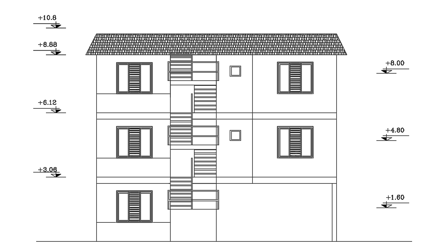 The front elevation view of the 8x12m bungalow building AutoCAD drawing is given in this file. This is three story house building. On this ground floor, the car parking, sit out, and common bathroom is available. On this first floor, the living room, kitchen, dining area, master bedroom, guest room, and common bathroom is available. On this second floor, the living room, master bedroom, kid’s room, guest room, and common bathroom is available. For more details download the AutoCAD drawing file from our website. Thank you for downloading the AutoCAD drawing file from our website.