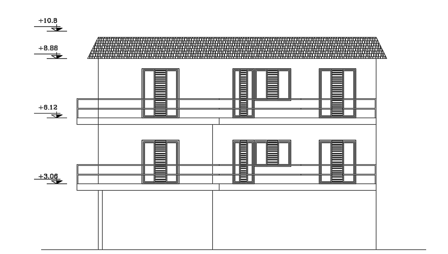 The left side elevation view of the 8x12m bungalow building AutoCAD drawing is given in this file. This is three story house building. On this ground floor, the car parking, sit out, and common bathroom is available. On this first floor, the living room, kitchen, dining area, master bedroom, guest room, and common bathroom is available. On this second floor, the living room, master bedroom, kid’s room, guest room, and common bathroom is available. For more details download the AutoCAD drawing file from our website. Thank you for downloading the AutoCAD drawing file from our website.