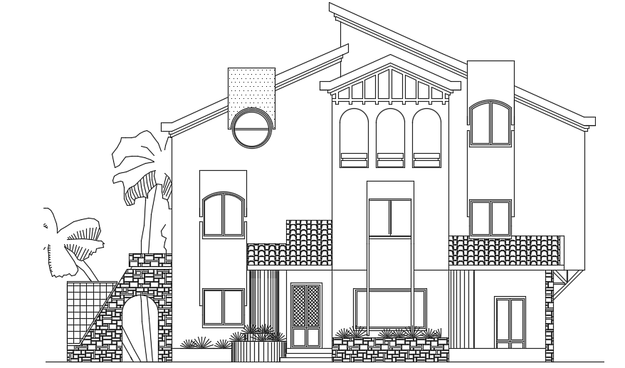 An elevation view of the 14x15m duplex house building AutoCAD model is given in this file. This is two story residential building. On this ground floor, the living room, kitchen, dining area, garage, salon, and common bathroom is available. On this first floor, the living room, master bedroom with the attached toilet, kid’s bedroom, guest bedroom, and common bathroom is available. On this roof floor, the common bathroom is available. For more details download the AutoCAD drawing file from our cadbull website.