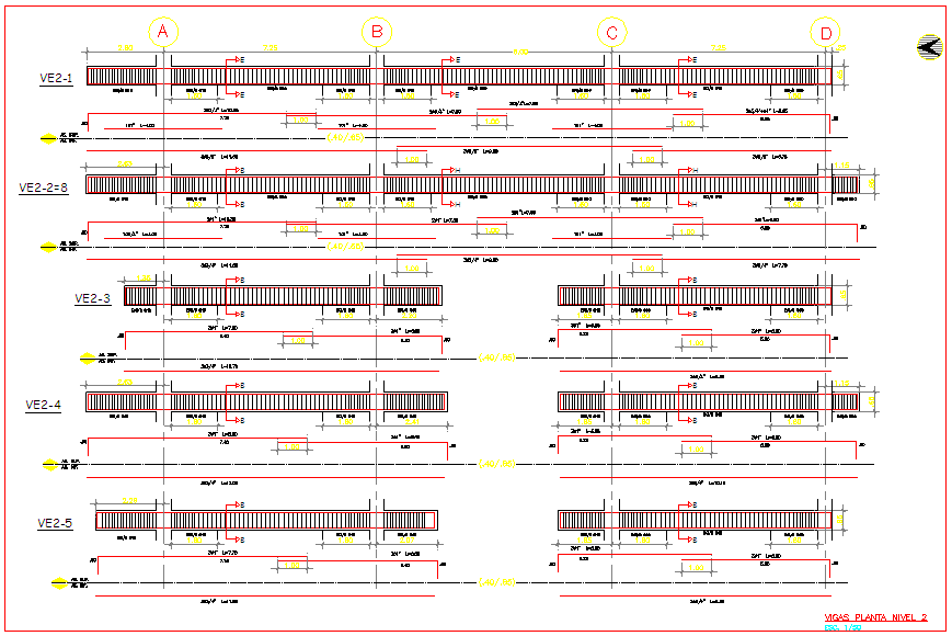 Structure Detail for second level floor dwg file with beam and column detail with dimension and sectional view for second floor level plan.