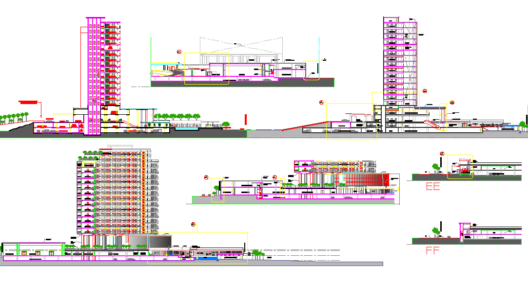 The architecture layout plan with basement 2 level parking plan, section plan, structureplan, section plan and elevation design of 15 Story Corporate Office Building project.