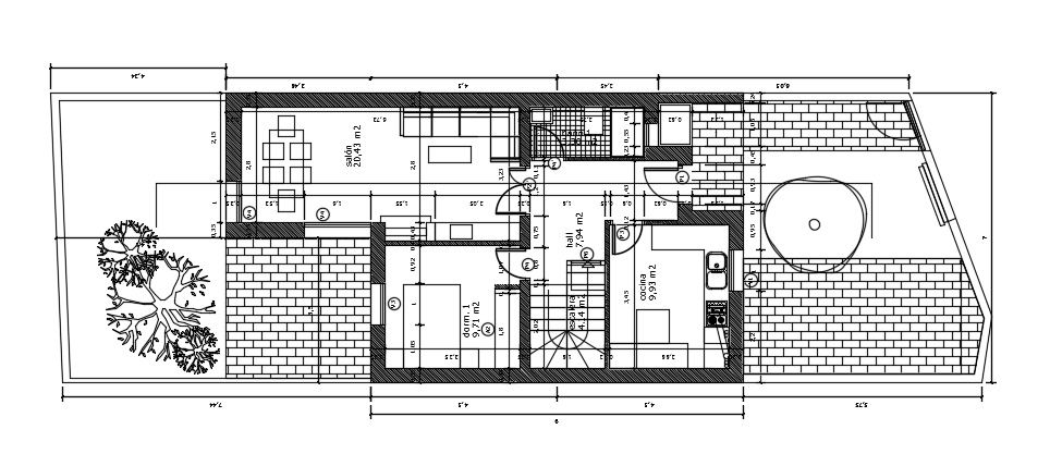 7x22m ground floor villa house plan AutoCAD model is given in this file. This is two story house building. On this ground floor, the living room, kitchen, family lounge area, master bedroom, and common bathroom is available. For more details download the AutoCAD drawing file from our cadbull website.