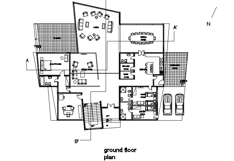 40x70m luxury villa ground floor is given in this file. The length and breadth of the villa plan are 26m and 24m respectively. This is two story villa building. On this ground floor, office room, living room, guest room, open terrace, family lounge area, kitchen, dining area, tools room, laundry room, maid room with the attached toilet, driver room with the attached toilet, garage, and common toilets are available. For more details download the AutoCAD drawing model from our cadbull website.