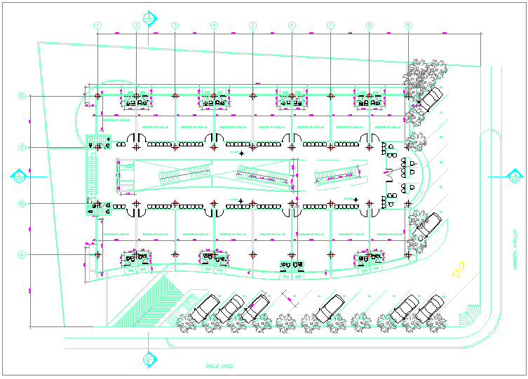 Structure Design for level 2 with column detail autocad file with view of column with parking,garden,washing area,distribution of area.