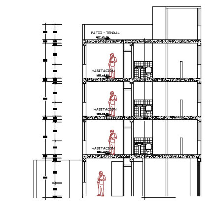 The front cut section view of the 6x24m four story apartment building AutoCAD is given in this file. This is G+ 3 apartment building. First floor, second floor, third floor, and fourth floor plans are given. On this ground floor, the garden, living room, kitchen, dining area, master bedroom, kid’s bedroom, and common bathroom is available. On this second floor, the office room, master bedroom with the attached toilet, kid’s bedroom, guest bedroom, and common bathroom is available. On this third floor, the office room, master bedroom with the attached toilet, kid’s bedroom, guest bedroom, and common bathroom is available. On this fourth floor, the office room, master bedroom with the attached toilet, kid’s bedroom, guest bedroom, and common bathroom is available.