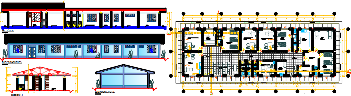 health center dwg file, layout plan of a health center, its elevation, cabins, furniture detail, big health center design in auto cad format