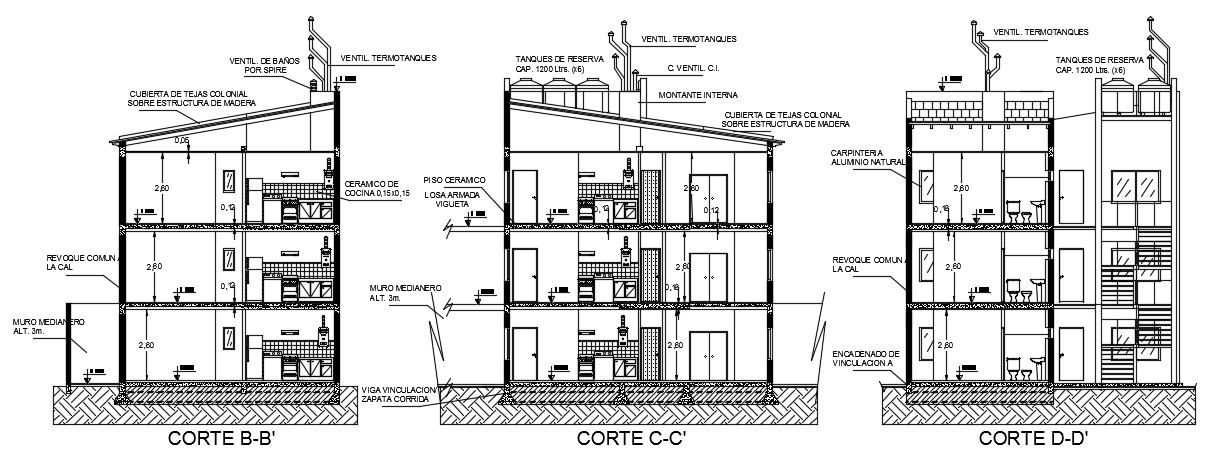 The front cut section views of the 34x10m three story residential building AutoCAD model