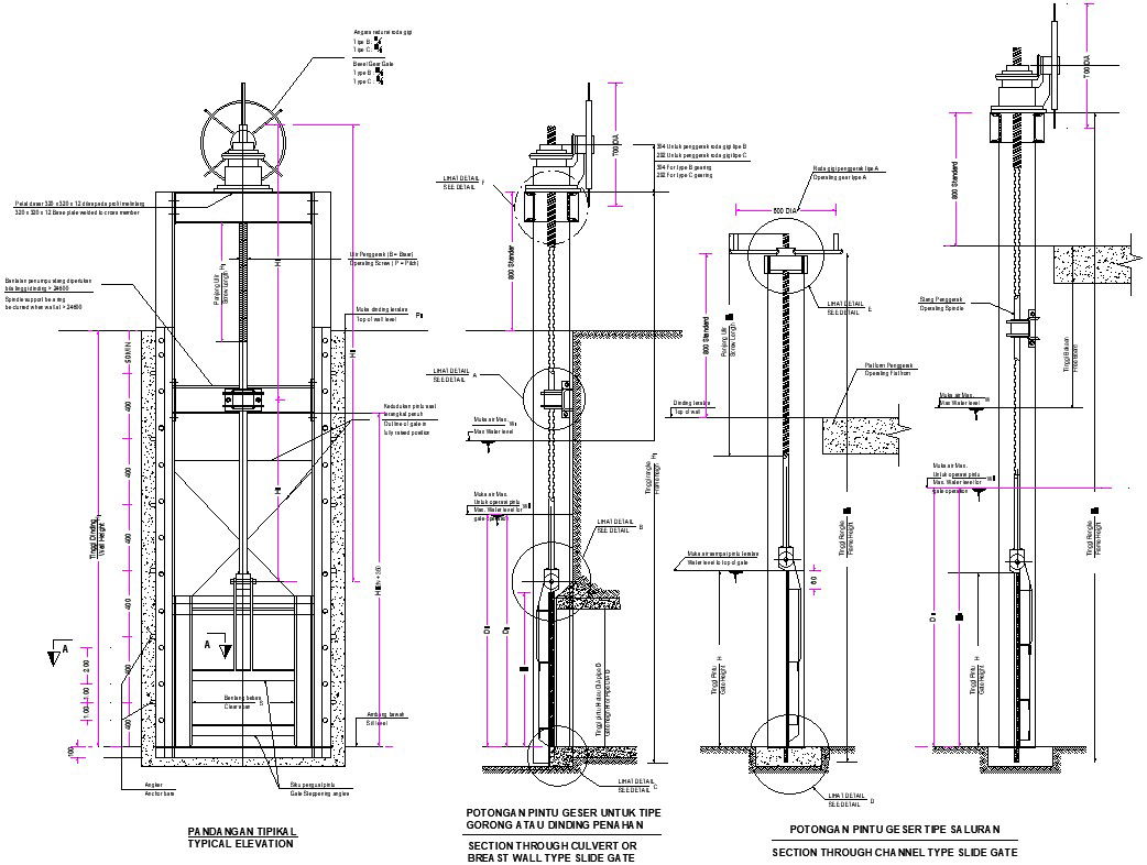 Gate typical elevation cad drawing is given in this file. Anchor, gate steppening angles, sill level, clear span, top of wall level, base plate, and other details are mentioned. Breast wall type slide gate, and channel type slide gate section drawings are given. For more details download the AutoCAD drawing file from our website.