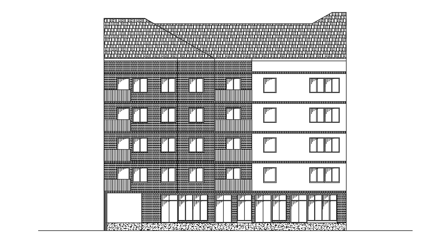 The back side elevation view of the 23x18m apartment house building AutoCAD drawing is given in this model. This is G+ 5 apartment building. Ground floor is provided for car parking. On this first floor, shops are available with the attached toilet is available. On this floor, four houses are available. On this second floor, the living room, kitchen, dining area, master bedroom, kid’s bedroom, and common bathroom is available. For more details download the AutoCAD drawing model from our website. Thank you for downloading the AutoCAD file from our cadbull website.