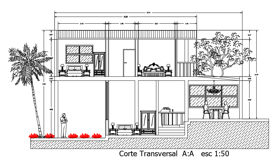 The back side cut section view of the 12x20m two story villa house building is given in this file. On this ground floor, the car parking, kitchen, dining area, living room, master bedroom with the attached toilet, hall, and common bathroom is available. On this first floor, the living room, master bedroom with the attached toilet, kid’s bedroom, guest bedroom, and common bathroom is available. For more details download the AutoCAD drawing model from our website. Thank you for downloading the AutoCAD file from our cadbull website.