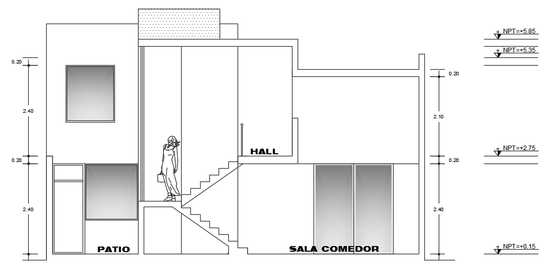A section view of the 10x14m two story house building AutoCAD drawing is given in this file. This is duplex house building. On this ground floor, hall, living room, drawing room, patio, dining area, kitchen, garden, service room, and common bathroom is available. On this first floor, the living room, master bedroom with the attached toilet, guest bedroom, kid’s bedroom, and common bathroom is available. For more details download the AutoCAD drawing model from our website. Thank you for downloading the AutoCAD file from our cadbull website.
