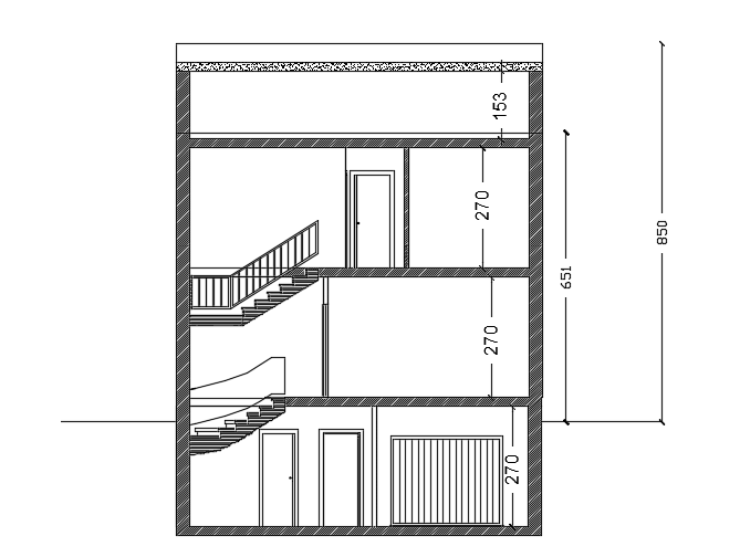 The front cut section view of the 8X12m three story house building with garage AutoCAD drawing is given