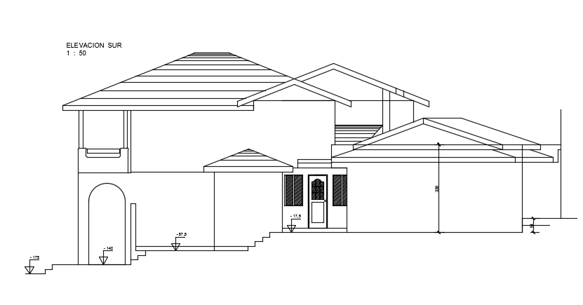 The south side elevation view of the 16x46m villa building AutoCAD drawing is given in this file. This is two story house building. On this ground floor, the car parking, living room, dining area, kitchen, patio, study room, billiards game room with the attached toilet, bodega, garden, and common bathroom is available. On this first floor, the master bedroom with the attached toilet, kid’s bedroom, guest bedroom, study room, and common bathroom is available. For more details download the AutoCAD drawing model from our website. Thank you for downloading the AutoCAD file from our cadbull website.
