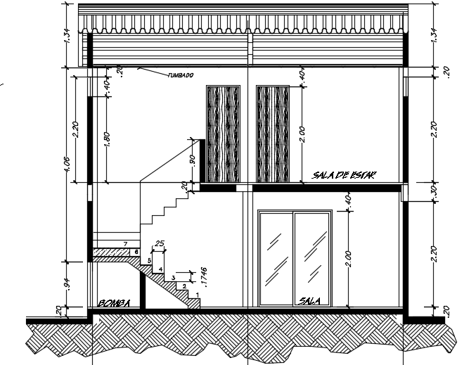 The front cut section view of the 7x10m architecture two story house building cad drawing is given in this file. On this ground floor, the living room, kitchen, dining area, patio service, and common bathroom is available. On this first floor, the master bedroom with the attached toilet, kid’s bedroom, two guest rooms, and common bathroom is available. For more details download the AutoCAD drawing model from our website. Thank you for downloading the AutoCAD file from our cadbull website.