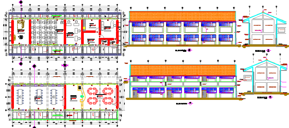 education center dwg file, layout plan of a education center , auditorium area, class rooms, elevation of the center in auto cad format