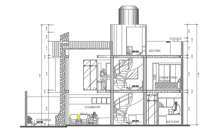 The front cut section view of the 13x8m wonderful two story bungalow house building is given in this file. This is g+ 1 bungalow building. On this ground floor, the car parking, kitchen, dining area, living room, drawing room, and common bathroom is available. On this first floor, the master bedroom with the attached toilet, kid’s bedroom, guest bedroom, and common bathroom is available. For more details download the AutoCAD drawing model from our website. Thank you for downloading the AutoCAD file from our cadbull website.