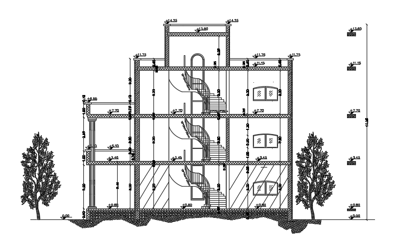 The left side cut section view of the 12x15m architecture house building cad 2d drawing is given in this file. This is three story residential building. On this ground floor, the living room, kitchen, dining area, master bedroom with the attached toilet, kid bedroom, family area, and common bathroom is available. On this first floor, living room, small kitchen, dining area, master bedroom with the attached toilet & bath tub, kid’s bedroom, guest bedroom, and common bathroom is available. On this second floor, living room, kitchen, dining area, master bedroom, guest bedroom, and common bathroom is available. For more details download the AutoCAD drawing model from our cadbull website. Thank you for downloading the AutoCAD files from our cadbull website.